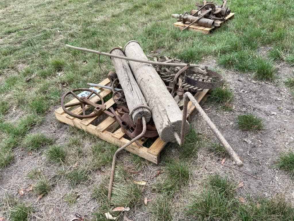 Old Cast iron tools, wooden rollers & fire grate